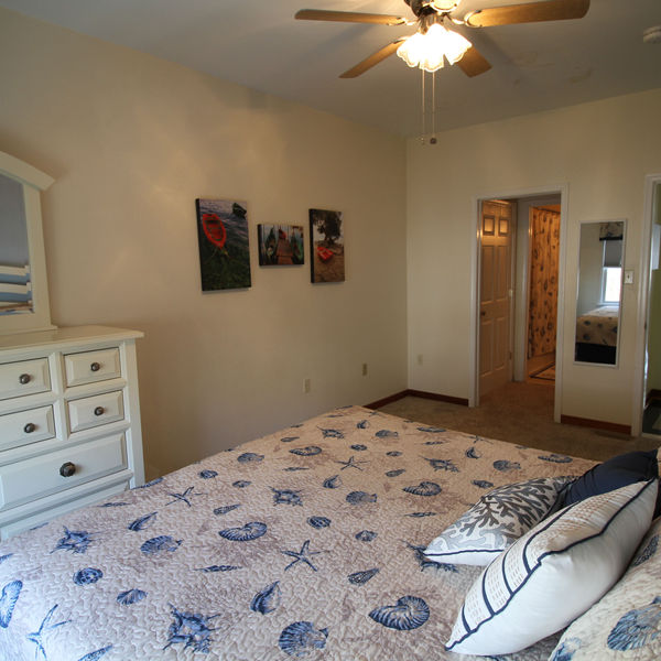 The closet provides a clothing rail, and ample shelving before leading into the bathroom. The bathroom features a jetted tub where you can relax and enjoy your vacation.